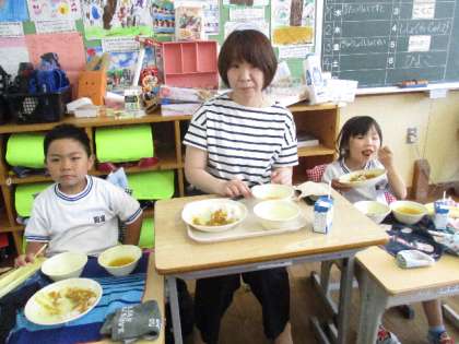 6月3日(金)、1年生の給食試食会を行いました。お家の方に来ていただき、一緒に給食を食べました。今日の
