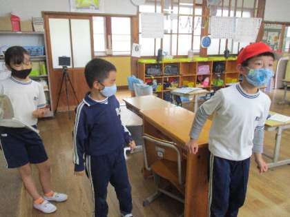6月6日(月)、2年生の国語は「名前を見てちょうだい」をみんなで劇にしています。読み方や動作を工夫して、えっちゃんになり切っていました。