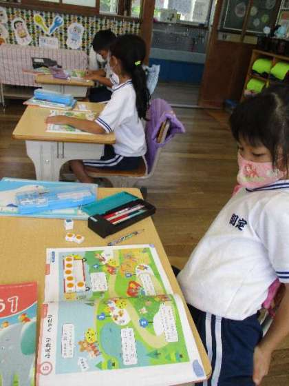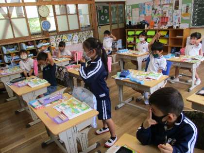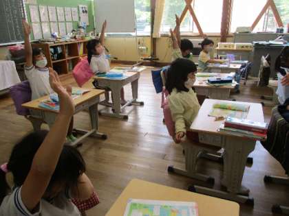 6月7日(火)、1年生がブロックを使って増えたり、減ったりの学習をしています。元気よく手を挙げています。
