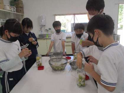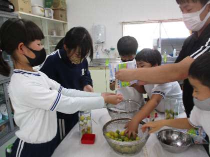 6月8日(火)、今度は4年生が梅シロップづくりです。みんなで調べたり、考えたりしながら、梅に穴をあけ、氷砂糖を入れていきました。いつできるかは、まだわかりません。予想しながら、作っていました。