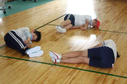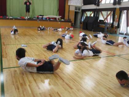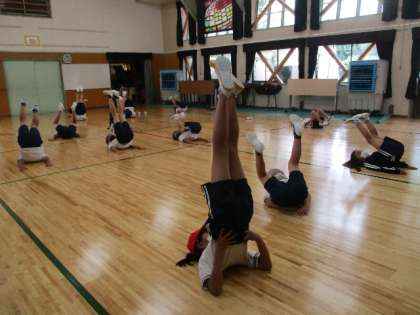 6月10日(金)、集会室で体をのびのびと動かす低学年です。手足を使わず、ぐるぐると回っています。