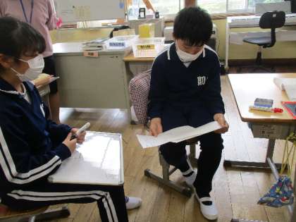 6年 国語 ペアで 公開日 2022/06/13 更新日 2022/06/13 各学年から 6月13日(月)、6年生の国語は「風切るつばさ」について読み取ったことをペアで話し合いながら、登場人物の関係を図に表していきました。 6年