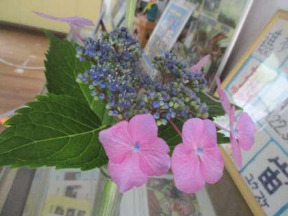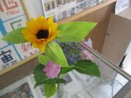 季節のお花 公開日 2022/06/17 更新日 2022/06/17 校長室から 6月16日(木)、登校してきた子が「おばあちゃんから」と言って、お花を渡してくれました。かわいいヒマワリとガクアジサイです。早速、玄関に飾らせていただきました。梅雨時のじめっとした空気が明るくなる気がします。