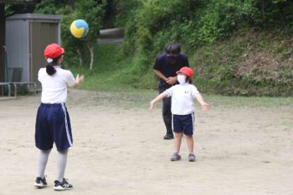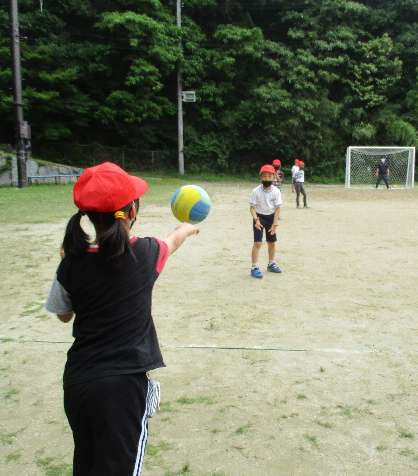 6月17日(金)の中学年のチャレンジは、二つのグループに分かれてボールを投げ渡し、どちらのチームが早くゴールの先生に渡せるかを競っていました。相手に取りやすいボールを投げて、一生懸命つないていきました。