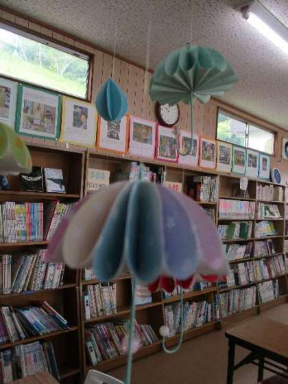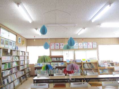 6月15日(水)に、「図書館に飾ってください」と、とてもかわいい飾りを作って、持ってきてくれた子がいます。雨の日にぴったりのモビールです。図書館でゆらゆら揺れています。お母さんと一緒に作ってくれたそうです。ありがとうございました。
