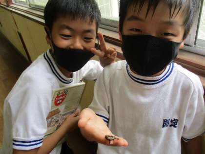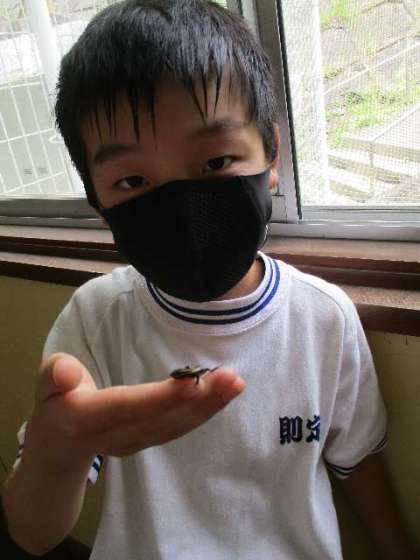 廊下に出てみると、4年生の子がかわいいニホントカゲの赤ちゃんを持ってきて見せてくれました。かわいいニホントカゲの赤ちゃんとそれに負けないかわいい笑顔です。