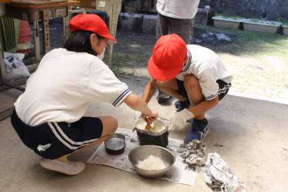 5年 キャンプの準備 公開日 2022/06/29 更新日 2022/06/29 各学年から 6月29日(水)、5年生が来週のキャンプのために、飯盒でご飯を炊く練習をしました。とても暑かったのですが、2グループに分かれてがんばって火をおこし、見事にご飯を炊き上げることができました。 5年