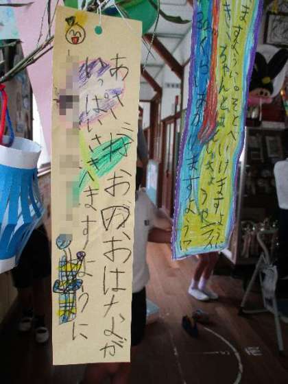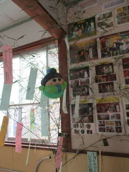 7月5日(火)、彦星様と織姫様のすてきなバルーンアートをいただいたので、早速七夕飾りにつけました。素敵がレベルアップしました。7日には、二人を一緒の笹につけてあげようと思います。かわいい願い事が増えています。