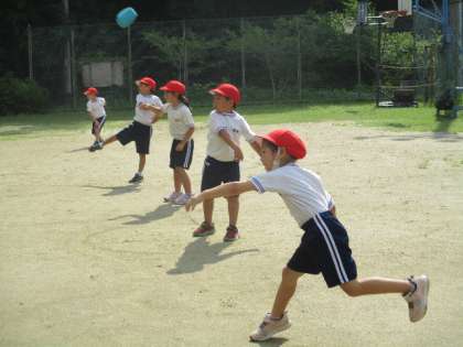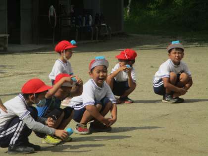 7月8日(金)のチャレンジです。7月になって、低学年は運動場で「投げる」に取り組みます。今日は、玉入れで使う玉を握って、思い切り遠くに投げようとがんばっていました。最後は、玉を頭にのせてのバランスです。