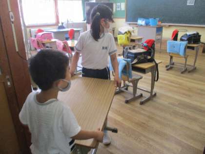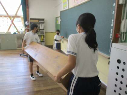 床を磨き終わると、みんなで協力して戸棚等を運びこみます。自分ができることを見つけて取り組んでいました。