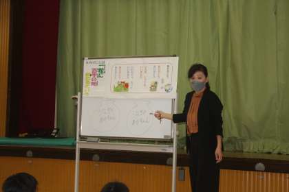 今月前半の生活目標は、「給食を残さず食べよう」です。6年生が発表しました。たくさん食べて、元気にうごきましょう。