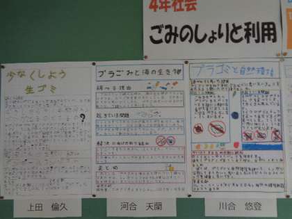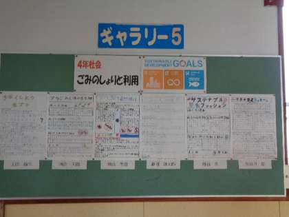 4年生教室前に、一人一人がごみについての課題を考え、調べたり、考えたりしたまとめが掲示してあります。学校公開日に見えた際には、ぜひご覧ください。