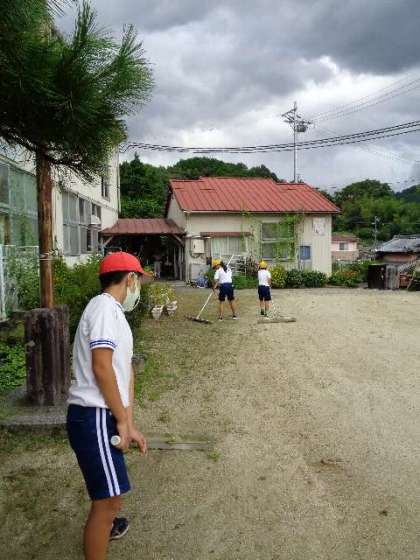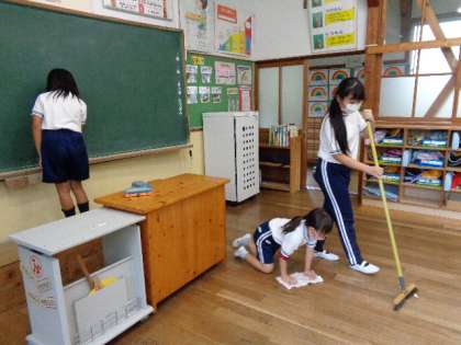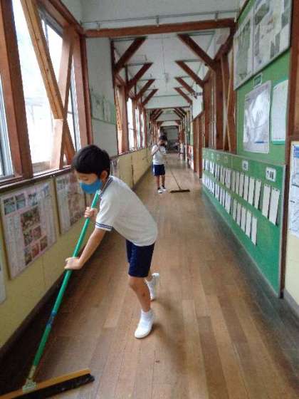 夏休み中にすっかりほこりやごみがたまってしまった校舎を掃除します。高学年と低学年が協力して掃除していくのは、則定小学校自慢の光景です。