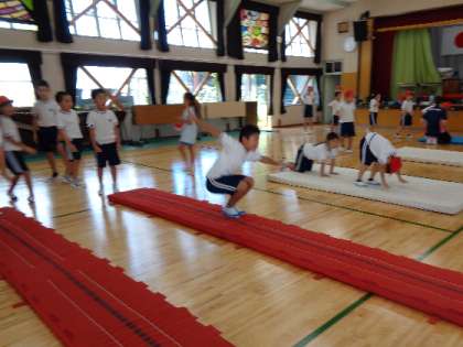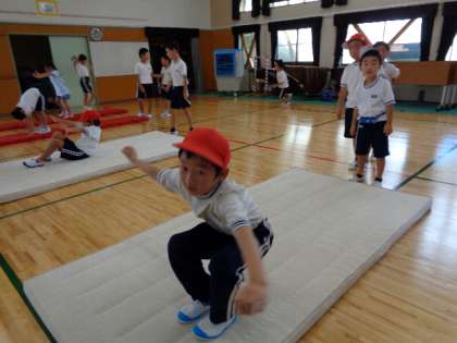 9月5日(月)、1・2年生の体育もマット運動です。くるりと回って、かっこいいポーズを決めていました。