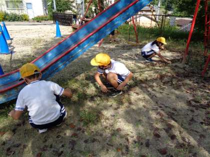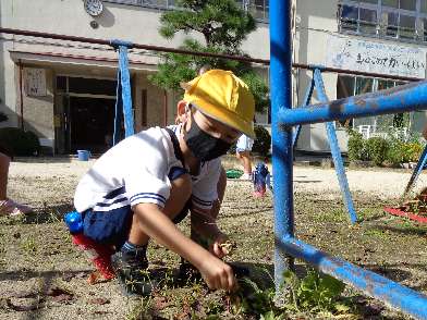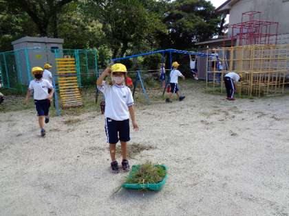 ひよこタイムの草取り 公開日 2022/09/05 更新日 2022/09/05 校長室から ひよこタイムには、1・2年生が毎回校庭の草取りをしています。 夏休み明けの9月5日(月)は、校庭に草がびっしりと生えていたので、みんなでたくさん草を取っていました。とてもきれいになりました。ありがとう。 1年 2年
