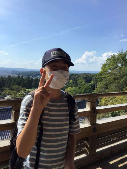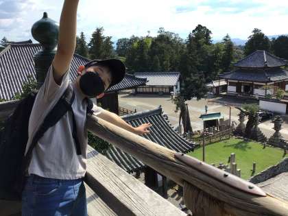 二月堂から、奈良の市街地が見えます。それぞれ、ポーズ。