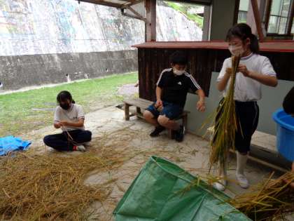 9月15日(木)、4年生は手刈りした稲をはざかけしました。