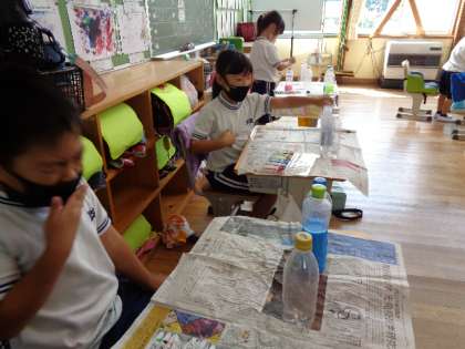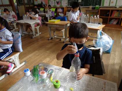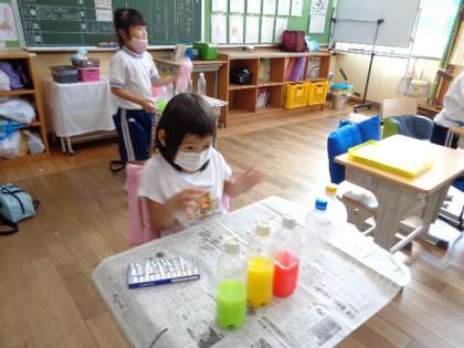 9月16日(金)、1年生の図工です。カラフルな色水が入ったペットボトルが机の上に並びました。