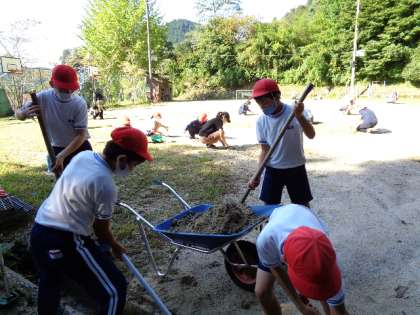 今年初めてのボランティアでの実施でしたが、お忙しい中、そして大変暑い中、多くの方に参加していただき、子どもたちと一緒に、運動場の草刈り、草取りや校庭の溝掃除、集会室の高い窓の掃除など、普段できないところや運動会に向けて整備など取り組んでくださいました。本当にありがとうございました。