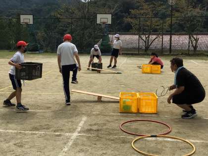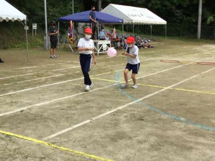 今年も親子で、風船割りをしたり、ボールをキャッチしたりします。今日は、一人2回ずつリレーして、わずかな差で赤の逆転勝ちでした。