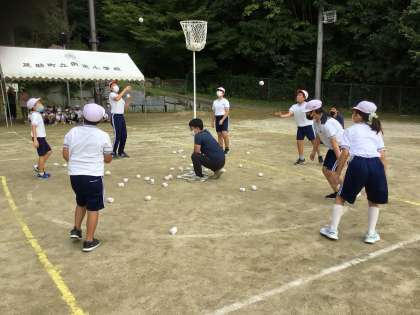 4〜6年の玉入れは、円の外から投げますし、カゴも高くなっています。