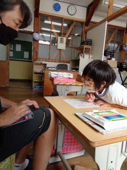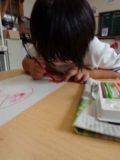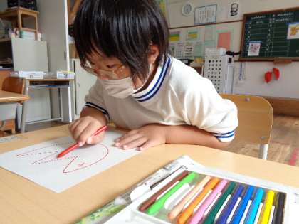 10月4日(火)、塗り絵をしている8組さんです。枠にはみ出さないように塗って、赤いチューリップが完成しました。
