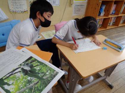 10月5日(水)、5年生は総合的な学習の時間で春から観察を続けている恩真寺湿地についてまとめています。これは、今週の土曜日8日に、一般のお客さん向けに恩真寺湿地についてガイドをするためのものです。