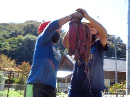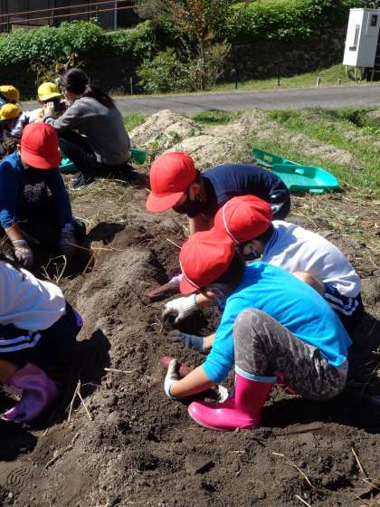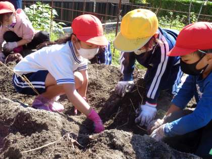 1・2年 お芋ほり 公開日 2022/10/14 更新日 2022/10/14 各学年から 10月14日(金)、1、2年生が畑のサツマイモを掘りました。一生懸命土を掘り進めていくと、見事なサツマイモがごろごろ出てきました。深くて難しいところは、友達と協力して、たくさん収穫しました。 1年 2年