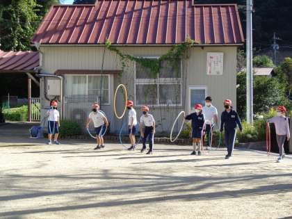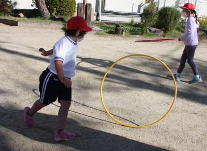 チャレンジ 中学年 公開日 2022/10/14 更新日 2022/10/14 学校の特色ある活動 中学年は校庭でフラフープを使っての運動です。フラフープが戻ってくるように回転を付けて投げる練習をしました。 3年 4年