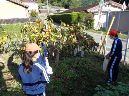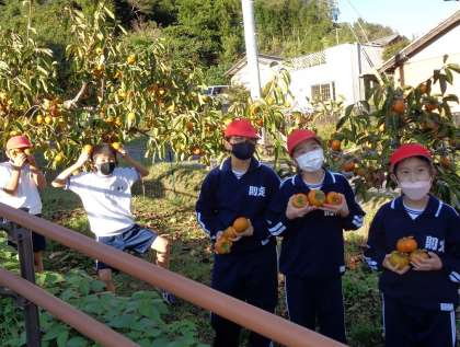 10月19日(水)、地域の方に声をかけていただいた柿採りをしていたのは、5、6年生です。どれが熟れておいしい柿かをじっくりと見定めながら、収穫させていただきました。
