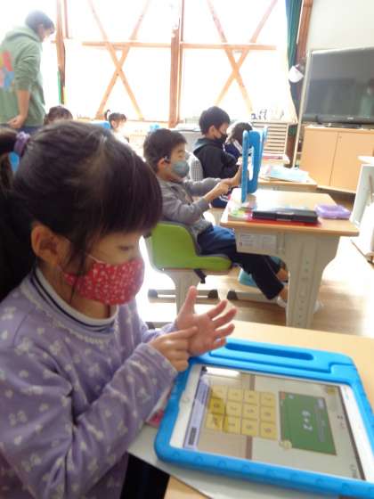 10月20日(木)、算数はタブレットで計算の練習をしています。足し算をしたり、出てきた数字の答えになるように数字をつなげたりと、いろいろな形で計算に親しんでいきます。