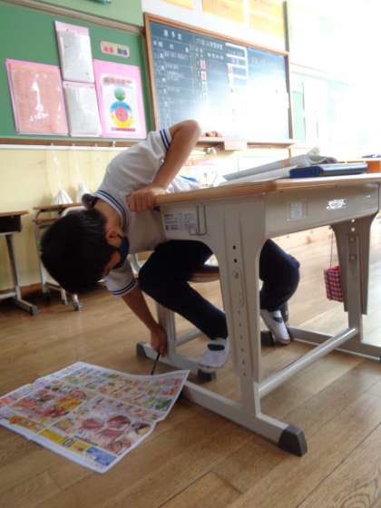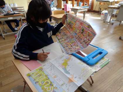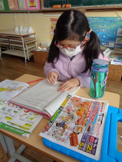 10月27日(水)、3年生は一生懸命チラシとにらめっこです。シャインマスカットやなし、豚肉などを見ながら、○○産という言葉を探し、地図の中に書き込んでいきます。愛知県は肉が多いねと発見したことを話していました。