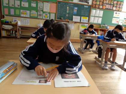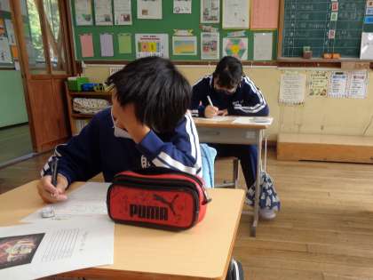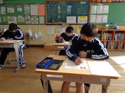 10月28日(金)、学芸会に向けての思いをまとめている5年生です。真剣な顔つきに気合が感じられます。