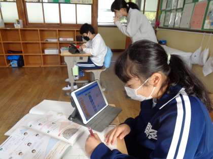 10月28日(金)、算数の図形の学習でプログラミングを利用して、図形を作成します。角度を計算しながら、思うように動くように悪戦苦闘中です。
