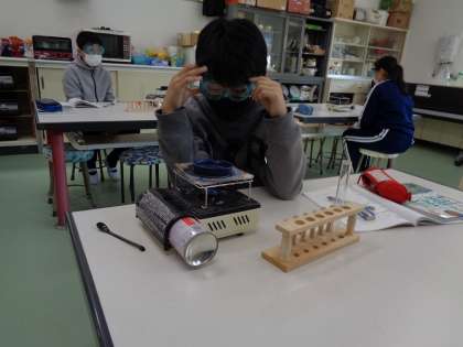 11月4日(金)、6年生の理科の実験の様子です。一人ずつ眼鏡をかけて実験をしている姿は、まるでどこかの研究室ラボのようです。