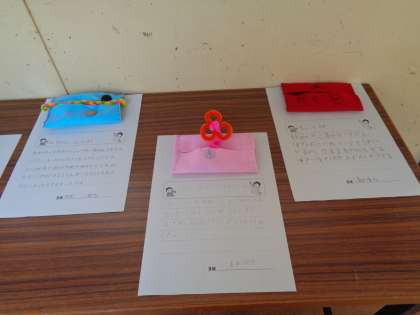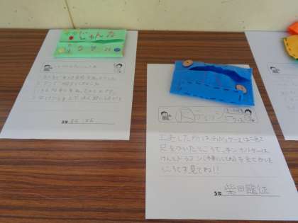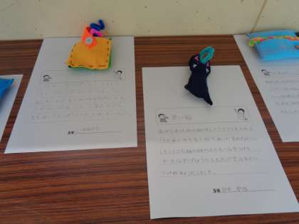5年生が家庭科の学習で作った作品が廊下に飾られています。かわいい、素敵な作品ばかりです。使い勝手もよさそうです。