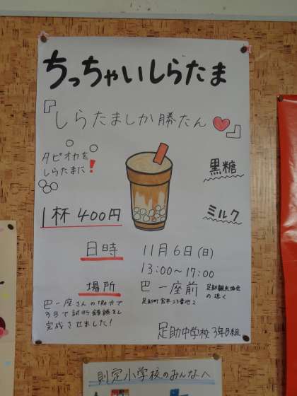 中学校より 公開日 2022/11/04 更新日 2022/11/04 校長室から 11月4日(金)、中学3年生の兄弟がいる子が、中学生が香嵐渓で販売する「しらたましかかたん」のポスターを持ってきたので、さっそく一階掲示板に貼りました。香嵐渓も少しずつ色づいてきています。少し人出は多いかもしれませんが、行く機会があればぜひ飲んでみてください。