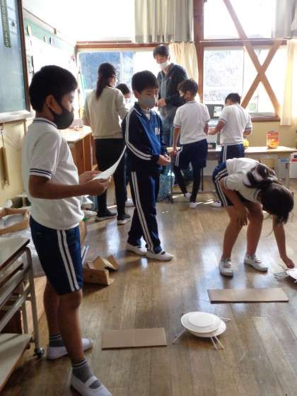 2年 生活科 おもちゃ作り みんなで遊ぼう 公開日 2022/11/07 更新日 2022/11/07 各学年から 11月7日(月)、2年生の生活科は、みんなでグループごとに作ったおもちゃで遊ぶ時間です。お店屋さんになった子は、遊び方のメモを見ながら一生懸命説明します。そして、一緒に遊びます。思いがけない遊び方が出てきたり、うまく動かなくて悩んだり・・・。みんなでわいわい楽しみました。 2年