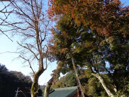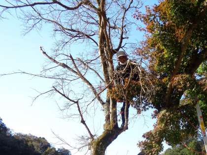 紅葉の枝切り 公開日 2022/11/10 更新日 2022/11/10 校長室から 11月10日(木)、校庭の紅葉の半分が枯れてしまっていました。枝が落ちると、ご近所に申し訳ないので、お願いして切っていただきました。命綱を付けて、木に登りながら切ってくださいました。日差しが入り、二宮金次郎さんの周りが明るくなった気がします。