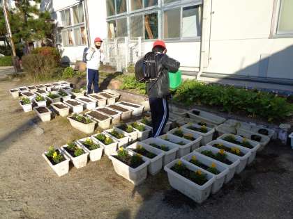 11月11日(金)、今日は三つの通学団の登校時間がほとんど一緒だったので、とてもにぎやかな校門坂になりました。パンジーの水やりも忘れません。自分の学年以外にもみずまきしてくれる高学年です。