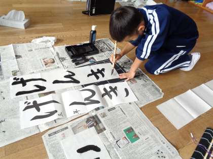 11月15日(火)、3年生は初めての毛筆での書初め練習です。大会は3〜6年がそろって床で書くので、教室でも床に広げて書きました。初練習ですが、大きく伸び伸びとした字が書けました。