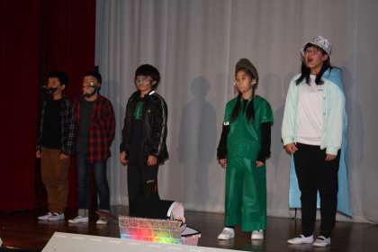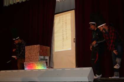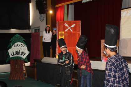 第6回は5年生です。国語の教科書に掲載されている、宮沢賢治の「注文の多い料理店」を演じます。5年生らしい、コミカルなハンターと山猫たちの掛け合いがさすがでした。