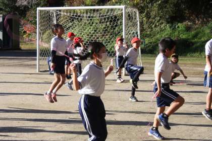 最初は、準備運動を兼ねての縄跳びです。「後ろ跳びは難しい」と言いながら、1年生も頑張っていました。