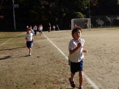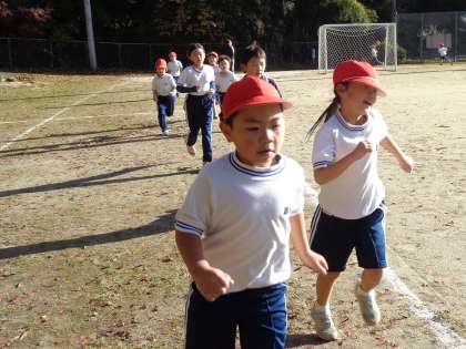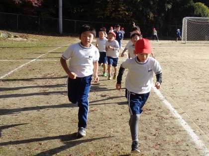 後半は、1,2年生が運動場に上がってきて走り出します。6分間です。自分のペースを落とすことなく、最後の1分はもてる力を出し尽くそうとダッシュします。