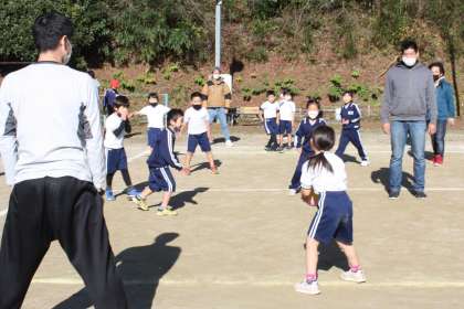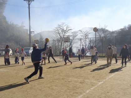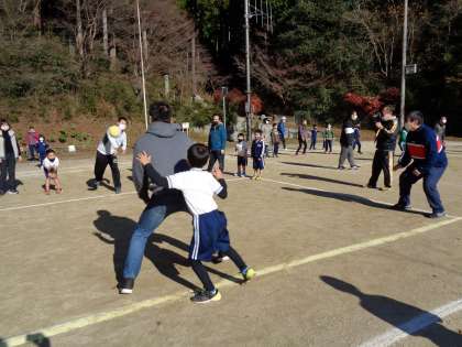 マラソン大会の後は、親子ふれあい活動です。ドッジボールと縄跳びをします。