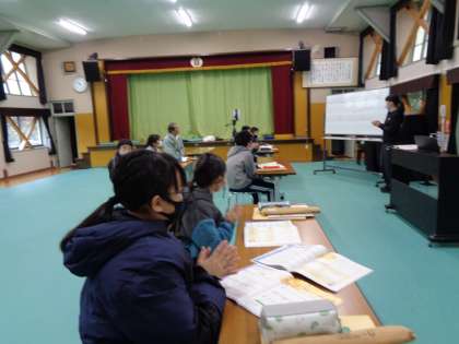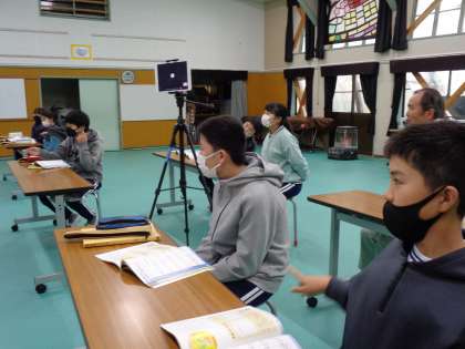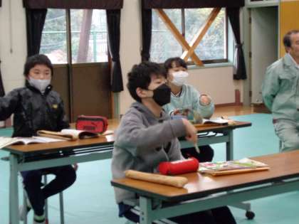 12月13日(火)、冷たい雨が降っていますが、5・6年生は集会室で音楽の学習です。考えていたのは、歌の拍子です。実際に手でリズムをとっていくと、3拍子や4拍子が実感できます。校内整備員さんも特別参加です。
