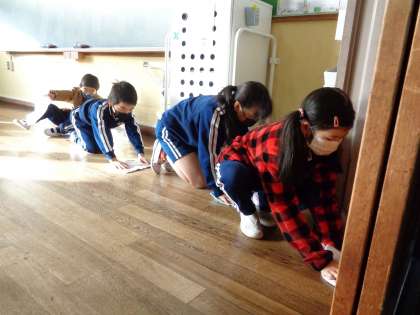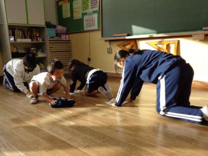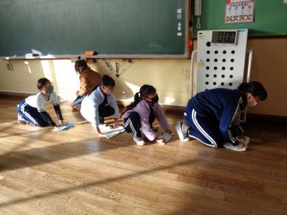 12月14日(水)、昨日はワックスがけをして下校したので、朝は教室をからぶきするところから始まりました。高学年をまねながら、縦一列になったり、追いかけっこをしたりしてごしごし床を磨き上げました。
