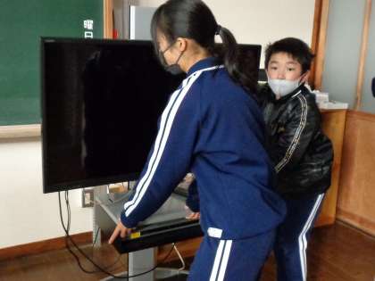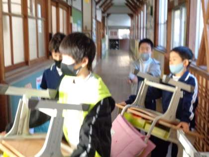 しっかりと磨いてくれた後は、教室の荷物をどんどん中に入れていきます。これも高学年を中心に協力してがんばります。早く終わったグループは、まだ終わっていないグループを助けていました。