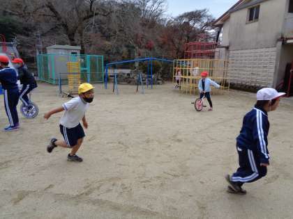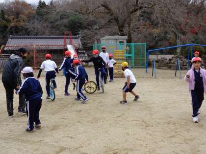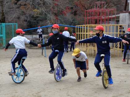 一気に寒くなってしまったように感じられた12月14日(水)ですが、わく1の校庭はにぎやかでした。一輪車を始めた1年生に続いて、「久しぶりだ。できるかな」と言いながら、3年生や4年生が加わりました。1年生は、上手に手をつなぐ一輪車の間をくぐることにチャレンジ中。元気な声が響く校庭でした。