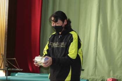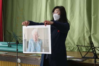 続いて、大竹先生からは、朗読訪問についてのお話がありました。2年ぶりに各地区の集会所で行う朗読訪問ですが、まだ新型コロナの制限があるので飲食はできません。その代わりに、子どもたちができることを地域の方に見せて楽しんでもらいたいと思っています。大竹先生が、お手玉やけん玉も、ジャグリングなどを紹介してくださいました。